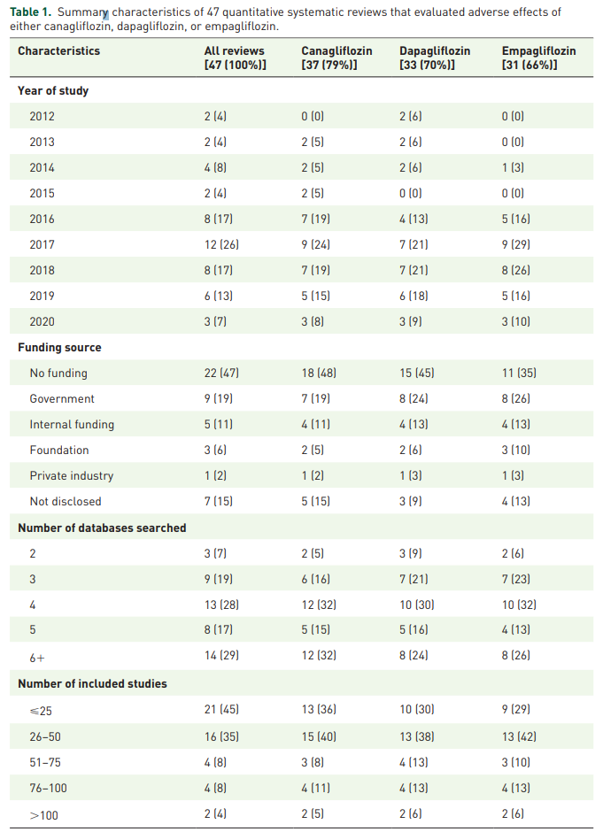 スクリーニングされた1,289件の内、47件がSGLT2阻害薬の安全性を評価し、その内の35件は方法論の質が低かった。