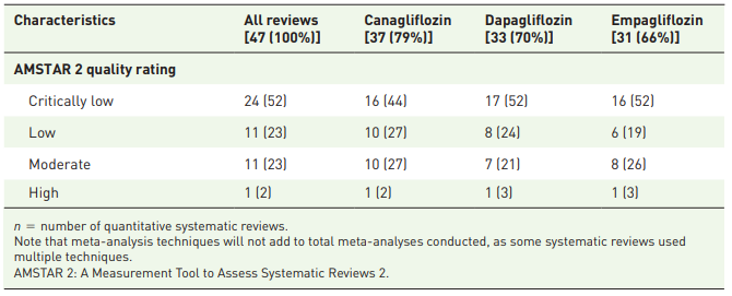 SGLT2阻害薬の有害事象について報告されている定量的系統的レビューの大半は、方法論の質が低かった(AMSTAR評価が低かった)。