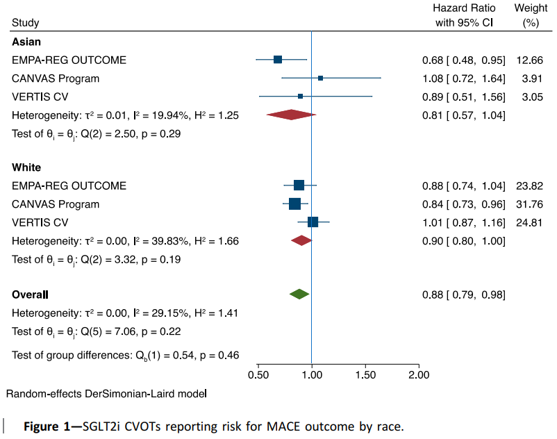 2型糖尿病を対象としたSGLT2阻害薬の4つの大規模臨床試験[EMPA-REG OUTCOME(エンパグリフロジン)、CANVAS Program(カナグリフロジン)、VERTIS CV(エルツグリフロジン)] における3P-MACE(心血管死・非致死的心筋梗塞・非致死的脳卒中)のハザード比は、アジア人(3,298例)と白人(20,258例)で、それぞれ、HR 0.81(95%CI 0.57-1.04)とHR 0.90(95%CI 0.80-1.00)となった。