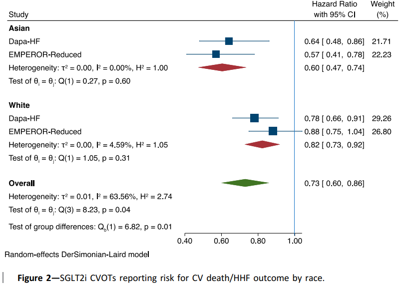 白人と比較して、2型糖尿病患者の有無に関わらず、SGLT2阻害薬で治療されたアジア人のHFrEF(LVEF≦40%)患者は「心血管死/心不全の悪化」に対するベネフィットをより享受できる可能性が示唆された。