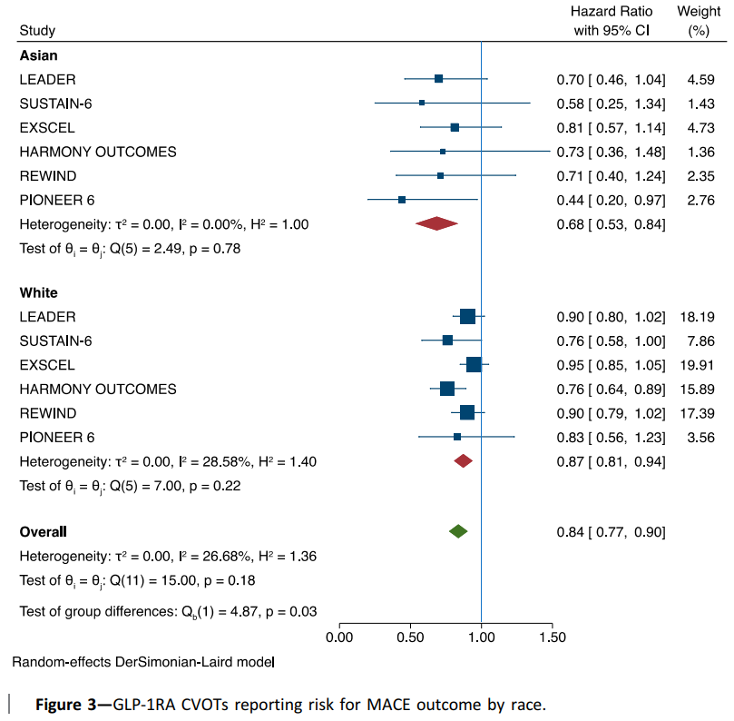 2型糖尿病患者を対象としたGLP-1受容体作動薬の6つの大規模臨床試験[LEADER(リラグルチド)、SUSTAIN-6(セマグルチド)、HARMONY OUTCOMES(アルビグルチド)、REWIND(デュラグルチド)、PIONEER6(経口セマグルチド)]における3P-MACE(心血管死・非致死的心筋梗塞・非致死的脳卒中)のハザード比は、アジア人(4,195例)と白人(37,530例)で、それぞれ、HR 0.68(95%CI 0.53-0.84)とHR 0.87(95%CI 0.81-0.94)となった。