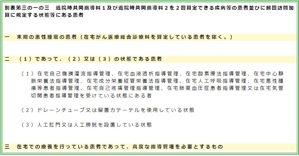 別表第三の一の三 退院時共同指導料1及び退院時共同指導料2を2回算定できる疾病等の患者並びに頻回訪問加算に規定する状態等にある患者