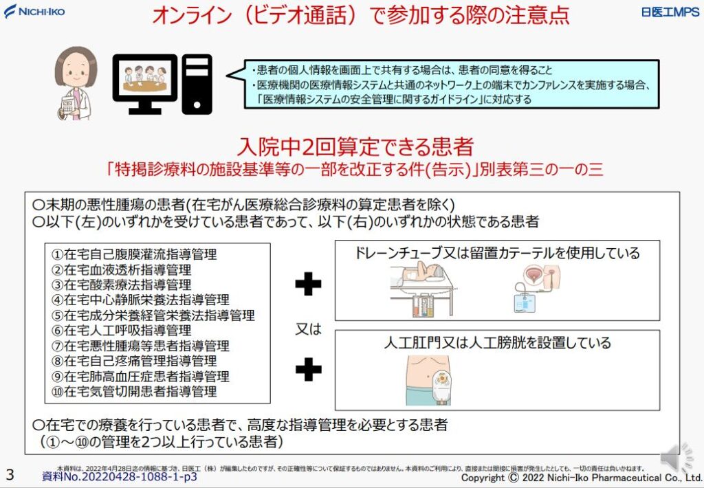また、保険医療機関の電子カルテなどを含む医療情報システムと共通のネットワークの端末において共同指導を実施する場合には、厚生労働省「医療情報システムの安全管理に関するガイドライン」に対応する。