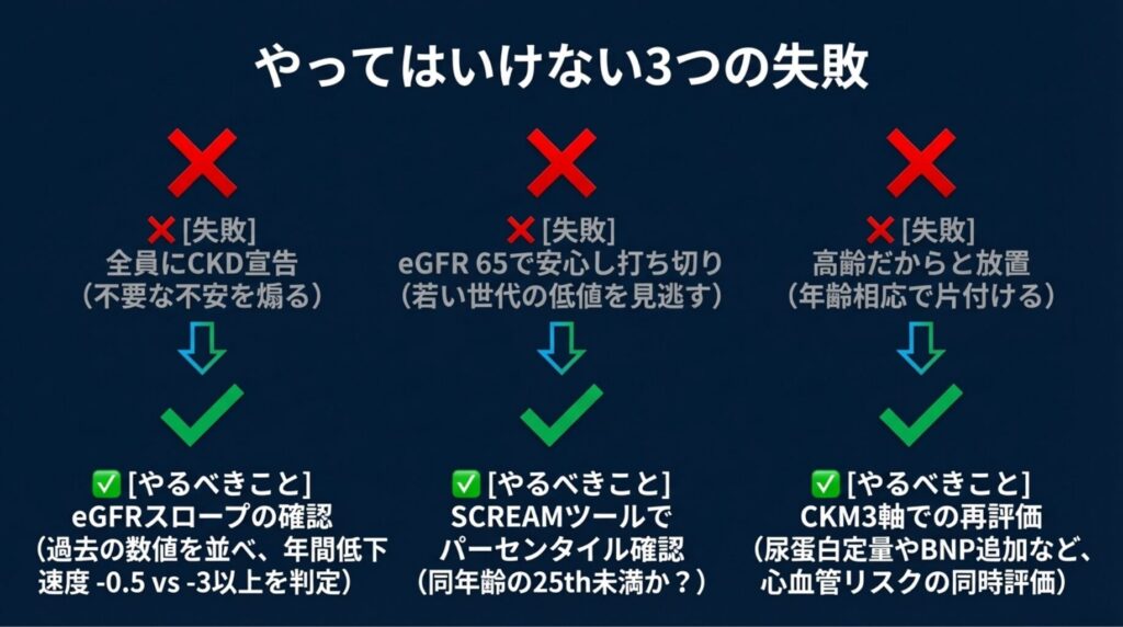 やるべきこと:CKDの診断ラベル自体は維持しつつ、eGFRスロープ(年間低下速度)を確認する。年間3 mL/min以上の低下が見られる場合は、年齢を問わず積極的な原因検索と介入を検討する。