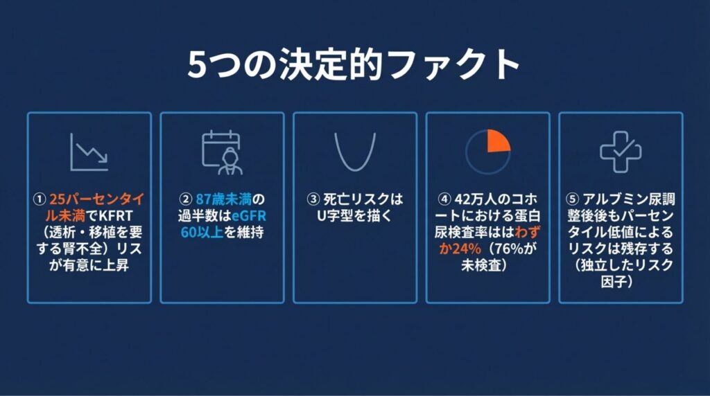 ✅ Yang論文の最大の発見は、eGFR 60以上であっても25パーセンタイル未満であればKFRTリスクが上昇するという点です。42万人以上がこの「隠れハイリスク群」に該当し、そのうち蛋白尿検査を受けたのはわずか24%です。