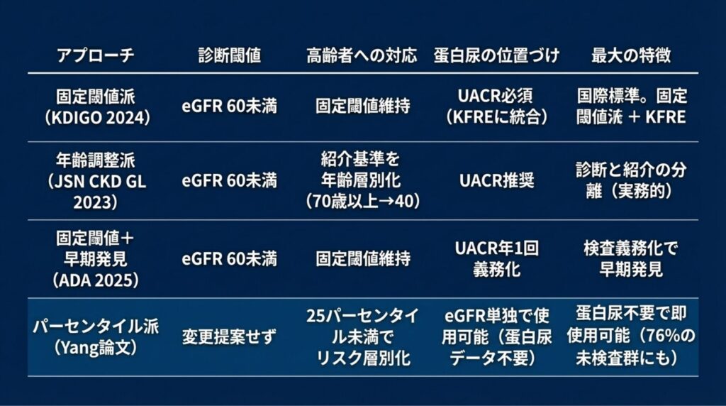 国際的にも、CKD診断の「eGFR 60未満」という固定閾値をめぐって、激しい論争が続いています。「高齢者は45未満に引き下げるべきだ」という年齢調整派と、「60のままでいい」という固定維持派の対立です。
