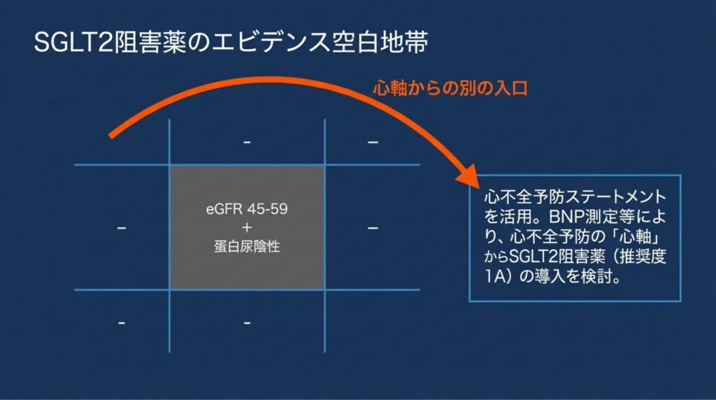 これはまさにCKMトライアングル(心・腎・代謝)の軸をまたぐ治療戦略です。腎軸のエビデンスが限定的な場合でも、心軸(心不全予防)からのアプローチで恩恵を受けられる可能性があります。これは記事⑩で解説したリレー型運用の「軸の切り替え」と同じ発想です。