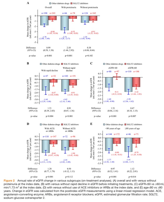 SGLT2阻害薬のeGFR低下抑制効果は、タンパク尿を有する患者、eGFRが60 mL/min/1.73 m²未満の患者、および基準日時点でACE阻害薬またはARBを服用している患者でより大きいことが示されました。