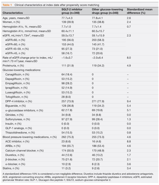 傾向スコアマッチングに基づき、本研究ではSGLT2阻害薬を新たに処方された348名の患者と、同数の他の血糖降下薬を新たに処方された患者を分析しました。