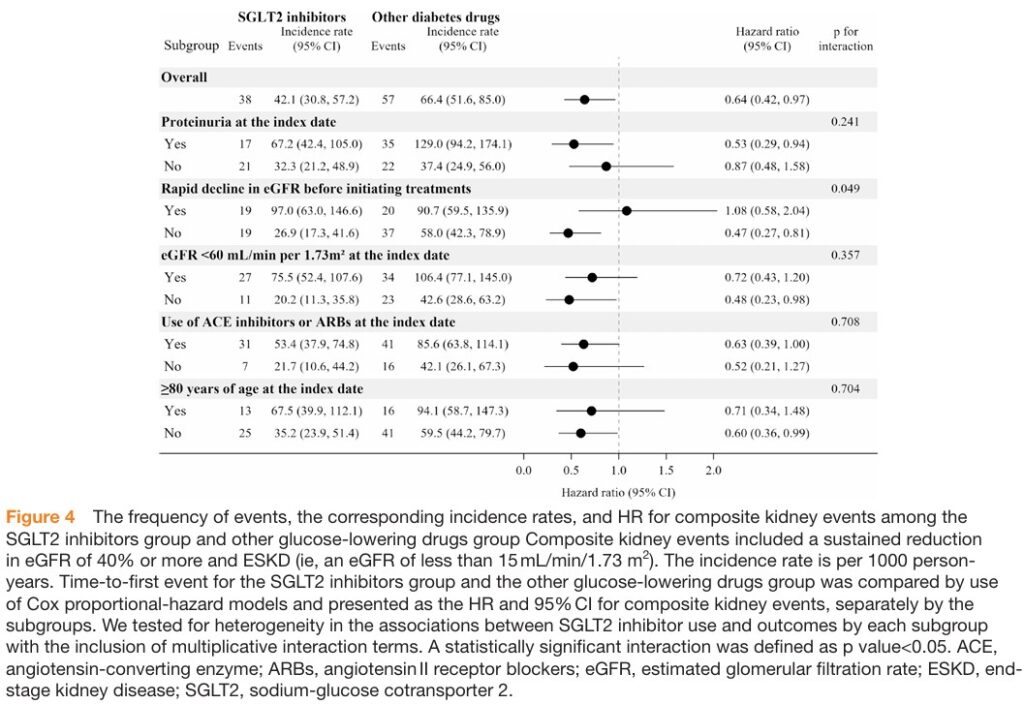 治療開始前のeGFR急速低下の有無に関して、SGLT2阻害薬群と他の血糖降下薬群の腎イベントリスクには不均一性が認められました(交互作用のp=0.049)。