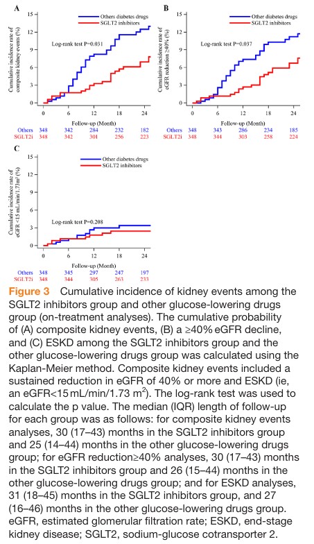 フォローアップ期間中、SGLT2阻害薬群ではeGFR50%以上の低下が19例、30%以上の低下が72例発生した一方、他の血糖降下薬群ではそれぞれ35例と90例が発生しました。