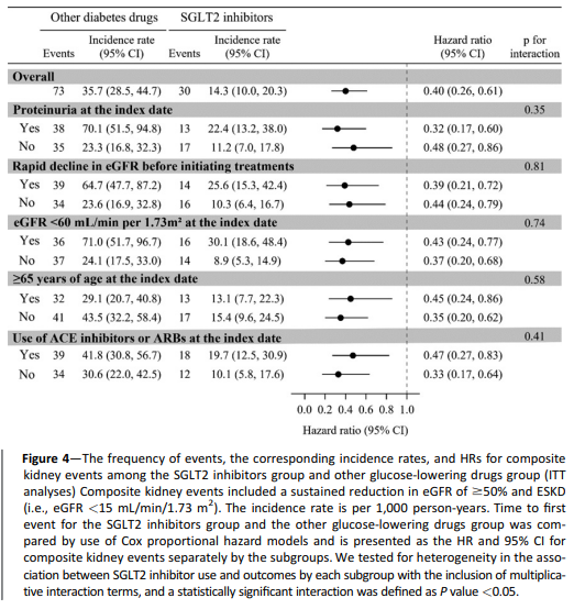 また、(他の血糖降下薬に併用した)SGLT2阻害薬の腎複合イベントリスクは、他の血糖降下薬と比較して、有意に低かった[HR0.40(95%CI 0.26-0.61);p<0.001]。