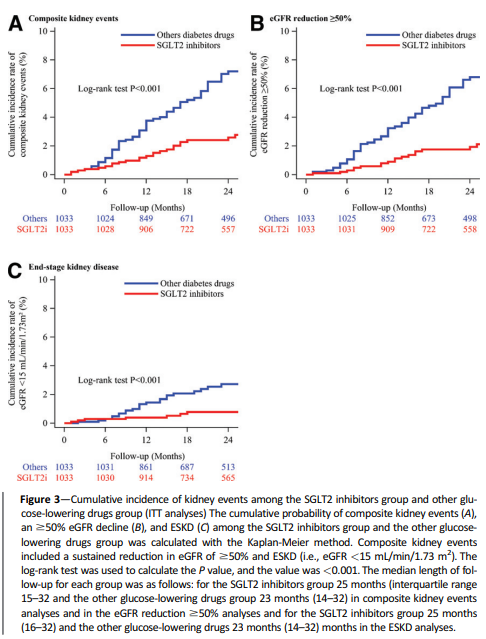 フォローアップ期間中に、腎複合イベント(50%以上のeGFR低下と末期腎不全)は、SGLT2阻害薬で30件[14/1,000人年]、他の血糖降下薬で73件[36/1,000人年]発生した。