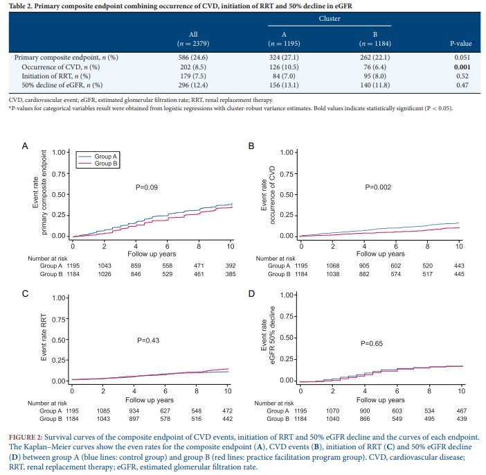 主要評価項目(CVDイベント、RRT開始、eGFR50%低下の複合エンドポイント)は、B群(集学的介入)の方がA群(標準介入)よりも低い傾向にあったが、その差は統計学的に有意ではなかった(p=0.051)。