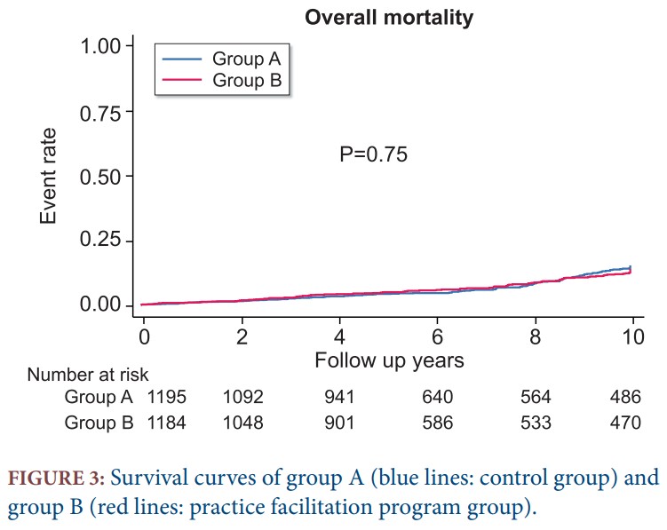 主要複合アウトカムに統計学的有意差はなかったが、CVDイベントの発生率はB群(集学的介入)で有意に低かった。