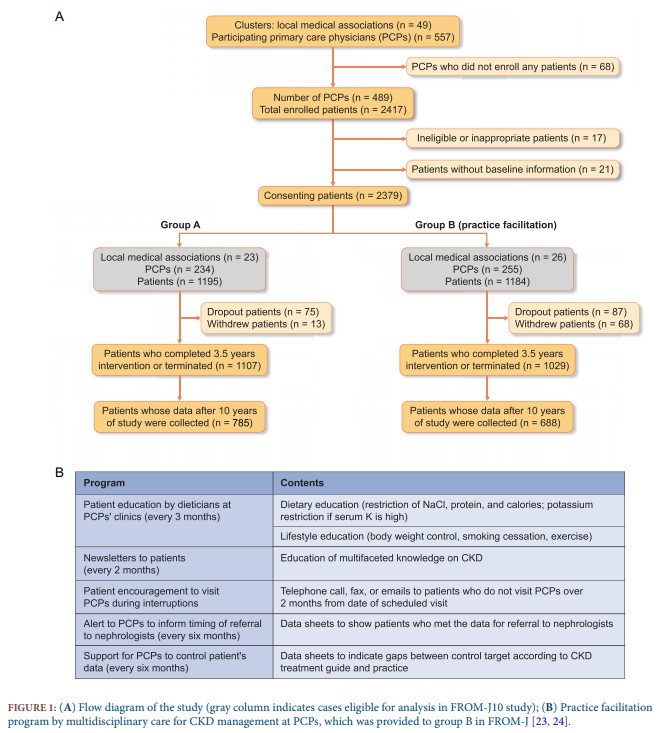 FROM-J10研究は、FROM-J試験に登録されたCKD患者のコホート研究であり、PCP(プライマリケア医)を対象としたCKD臨床促進プログラムの有効性を評価するクラスター無作為化比較試験であり、A群(標準介入:CKD診療ガイドブックに従った標準治療)とB群(診療促進プログラムによる集学的ケア介入)の2群からなる。