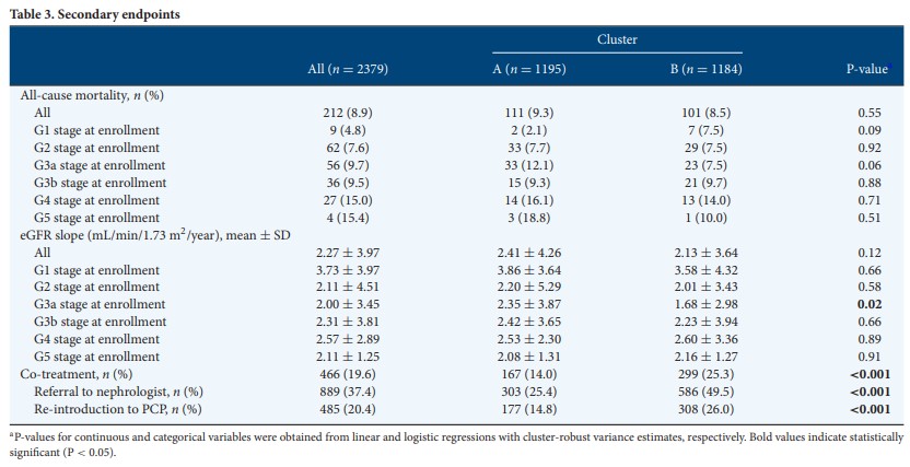 副次評価項目は、「死亡率、eGFR低下率、PCP(プライマリケア医)と腎臓専門医の連携率」であった。