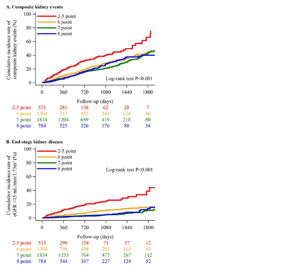 追跡期間中、低遵守群(0~5点)では143件の複合腎イベント(eGFR 30%以上低下またはESKD)が観察され、8点群でも同じく143件のイベントが記録されました(表3)。