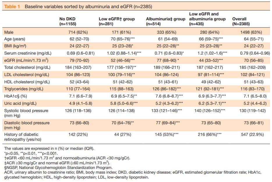 維持透析患者、または登録時のACRまたはeGFRデータが欠落している患者を除き、2,385例の患者が本研究に含まれた。
