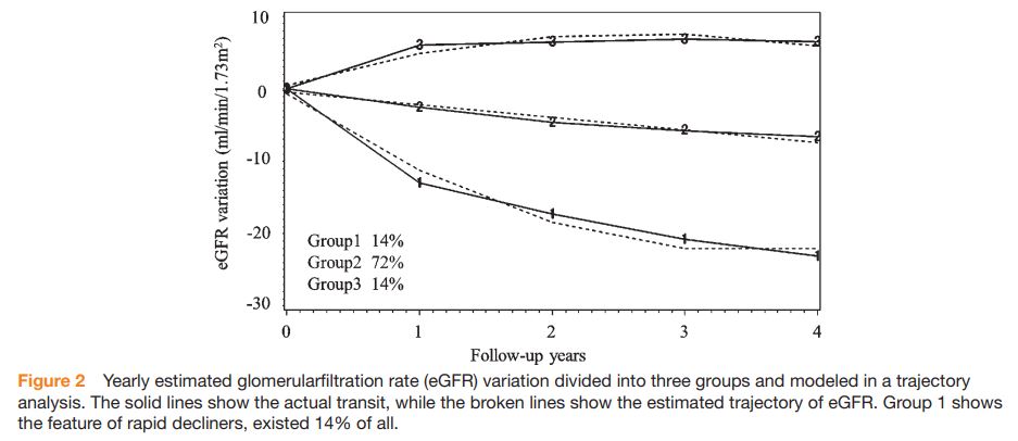eGFRの軌跡によって、急速なeGFR低下を示す患者をグループ1(14%の患者)、中程度の低下を示す患者をグループ2(72%の患者)、徐々に上昇を示す患者をグループ3(14%の患者)に分類した。