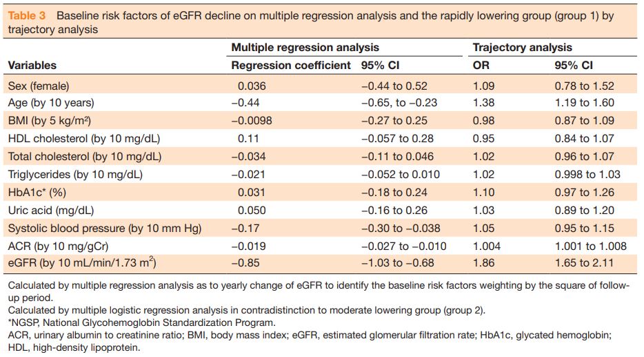 となり、「高齢、eGFR高値、ACR高値」が危険因子であることが示された。