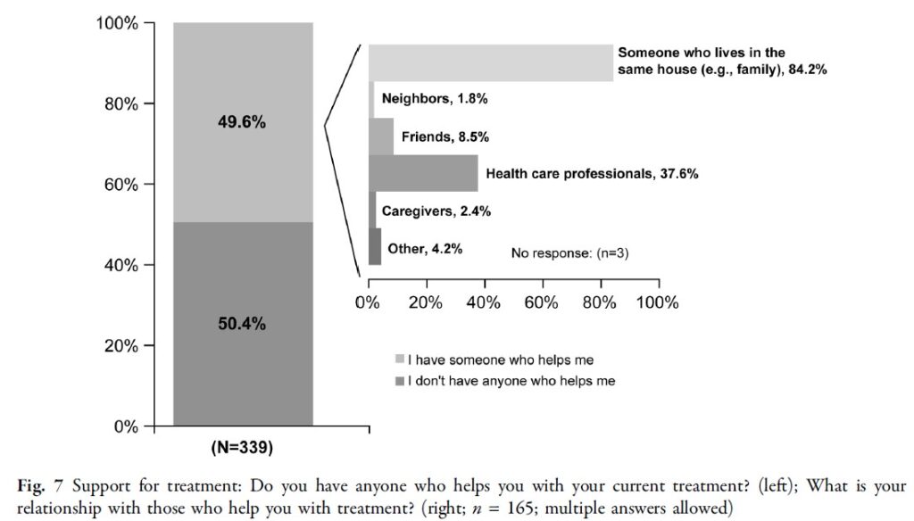 支援を受けている人々の中では、参加者と同居する人(家族など)が最も一般的な支援提供者(84.2%)であり、次いで医療従事者(37.6%)が続きました(図7)。