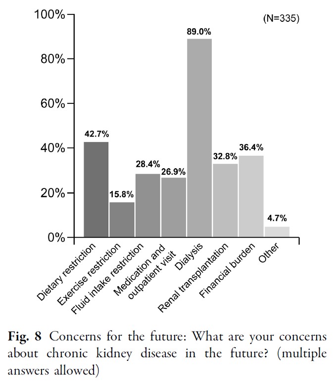 将来に対する最も一般的な懸念理由は透析であり、次いで食事制限、経済的負担、腎移植が続きました(図8)。