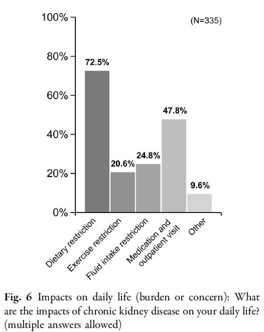 日常生活における最も一般的な負担は食事制限であり、次いで薬物療法/外来通院、水分摂取制限、運動制限が続きました(図6)。