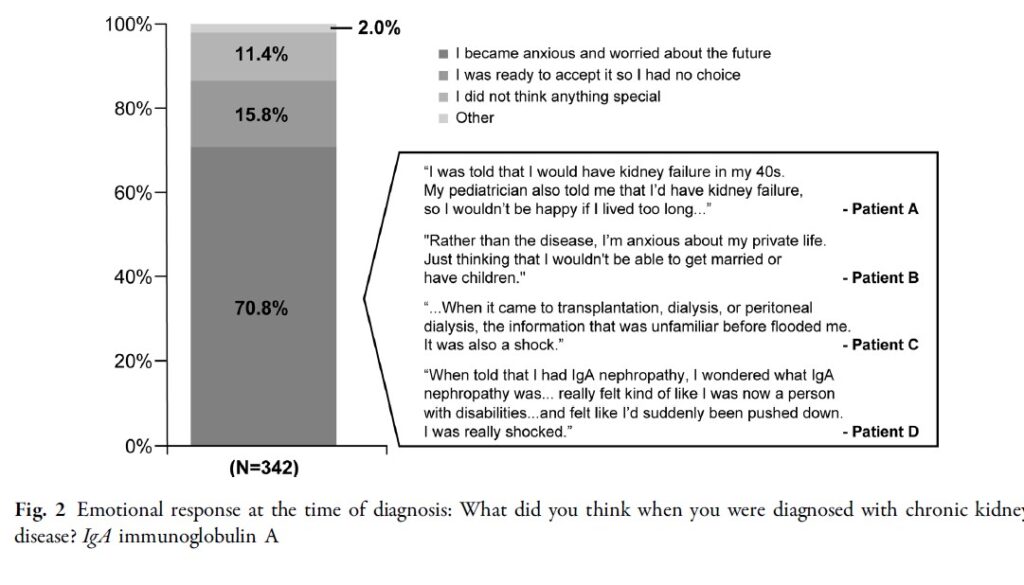 CKD診断時に70%の参加者が将来について心配を感じた一方、残りの30%は特に何も感じなかったか、予想していたため諦めの気持ちで診断を受け入れていました(図2)。