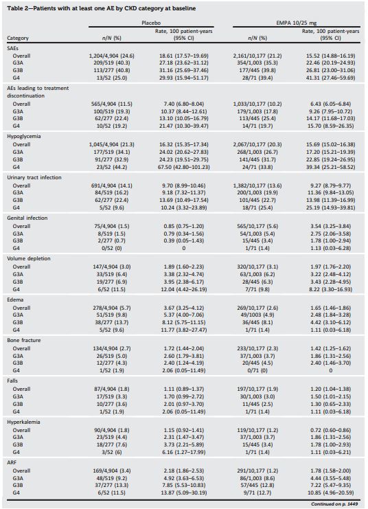 コホート全体およびCKD重症度のカテゴリー全体において、中止につながる重篤な有害事象および有害事象の発生率(100人/年)は、エンパグリフロジン群およびプラセボ群の間で類似していた。