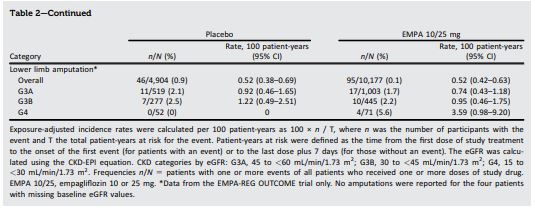 コホート全体およびCKD重症度のカテゴリー全体において、特に関心のある有害事象(下肢切断、急性腎障害を含む)の発生率は、エンパグリフロジン群およびプラセボ群の間で類似していた。