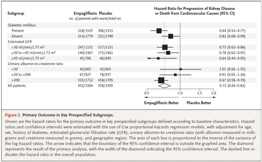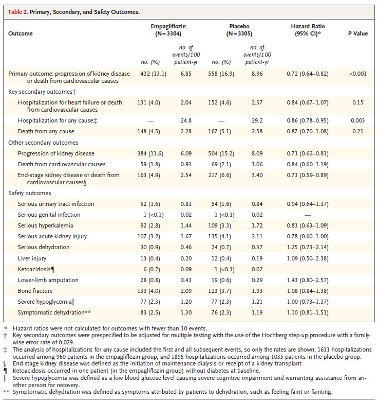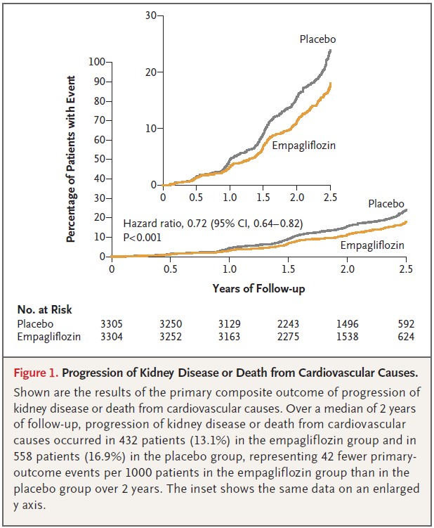 主要アウトカムの「腎疾患の進行または心血管死」は、エンパグリフロジン群で3,304例の内432例(13.1%)、プラセボ群で3,305例の内558例(16.9%)で発生し、プラセボ群に対するエンパグリフロジン群のハザード比は、[HR 0.72(0.64-0.82); p<0.001]となった。