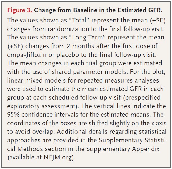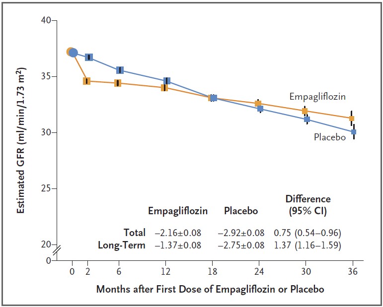 様々なGFR、アルブミン尿レベル、CKDの原因を有する患者集団において、エンパグリフロジンは、プラセボと比較して、腎疾患の進行または心血管死(心血管系の原因による死亡)のリスクを28%低下させ、安全性に大きな懸念はなかった。