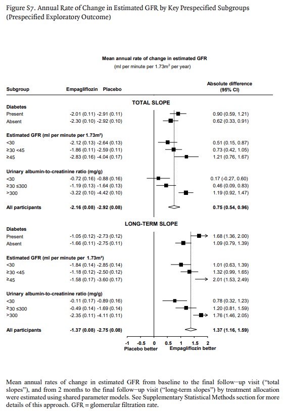 また、SGLT2阻害薬投与による初期eGFR低下(イニシャルディップ)後の無作為化2ヶ月後から最終フォローアップ時(Long-Term期間)のeGFR推定年間低下速度(mL/min/1.73㎡/year)におけるプラセボ群(–2.75±0.08)とエンパグリフロジン群(–1.37±0.08)の差を検討したところ、1.37 (1.16–1.59) mL/min/1.73㎡/yearとなり、エンパグリフロジン群のより大きなベネフィットが示された。
