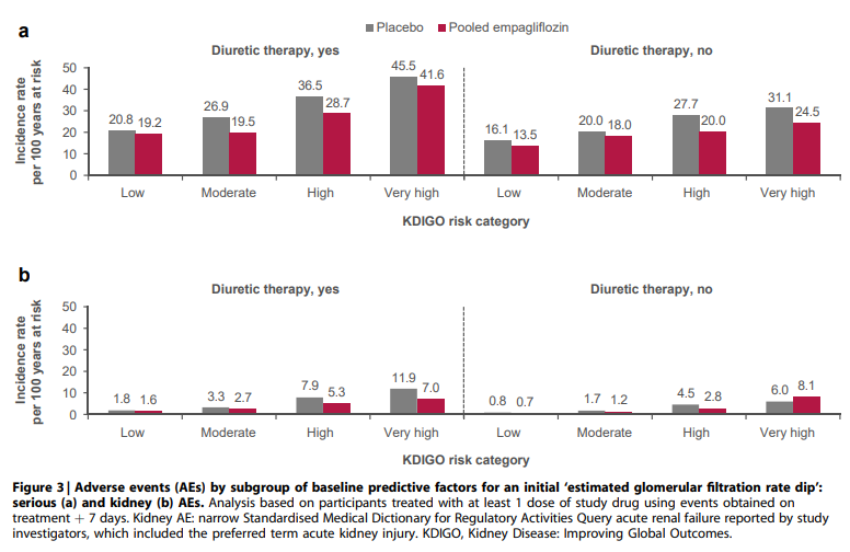 安全性は、KDIGOリスクのカテゴリー(Low、Moderate、High、Very high)とベースラインでの利尿薬治療の有無に分けて、全体の有害事象(AE)と腎臓関連のAE(AKI等)リスクを分析した。
